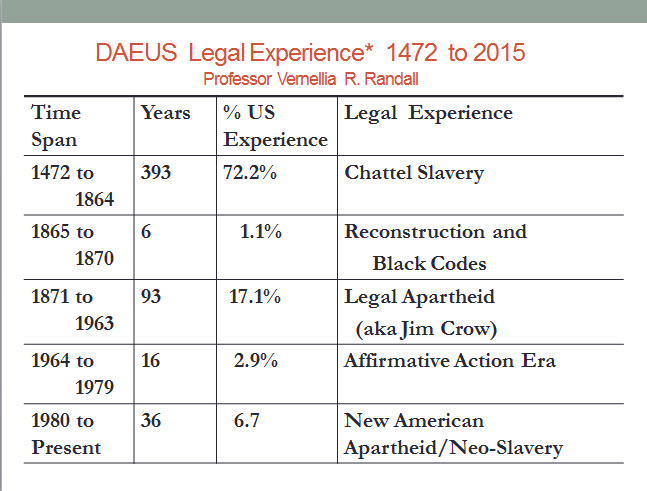 17. Understanding this historical trajectory is essential to understanding the situation of DAEUS. The cultural and social dynamics that followed each phase of these historical periods targeted DAEUS. DAEUS fought, struggled, and died to hold the nation founded on the principles of freedom and democracy to these philosophical ideals. From 1492 through the Modern Civil Rights Movement to today in the new American Apartheid, a system of white supremacy based on anti-black racism has been allowed to continue. Thus, the Descendants of Enslaved Africans have been vulnerable throughout this history.